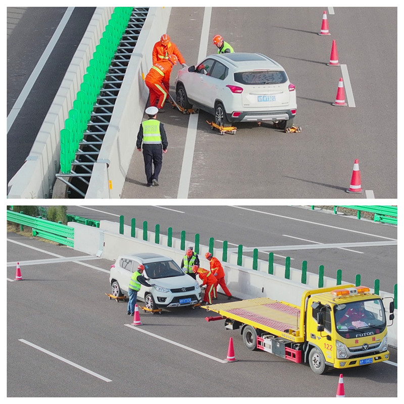 演練現場,信息中心接到巡邏交警指令,迅速通知應急、救援單位立即趕赴現場處置。施救人員到達現場后首先按規范布設作業區,利用專用移車拖車設備實施拖移作業,并迅速撤離現場。