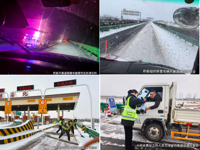 降雪伊始,市城投交控公司“以雪為令”,迅速啟動除雪保暢應急預案,在上級交通運輸主管部門和集團公司的指導調度下,聯合高速交警、路政、養護等相關單位,統籌“備戰、除雪、便民”全環節,高效推進保暢工作。依托路網監控與路面巡查實時掌握雪情,通過情報板發布預警提示司乘人員;除雪隊伍按預設路線集結,撒布車與鏟雪車梯隊推進,人工小分隊精準清理機械盲區,實現“邊降雪、邊清理、邊保暢”閉環作業。同時,公司黨員干部主動擔當,在各收費站、服務區開展除雪作業,加強出入口車輛管控提示,配足熱水、常用藥品及簡易維修工具,為過往司乘人員提供出行引導與便民服務,及時解決實際困難。
