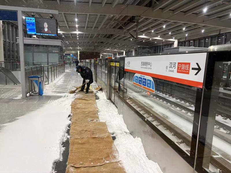各車站員工迅速投入掃雪除冰作業,截至首班車到站前,車站站臺、站廳及站外區域積雪基本清理完畢,確保乘客乘降環境安全暢通。