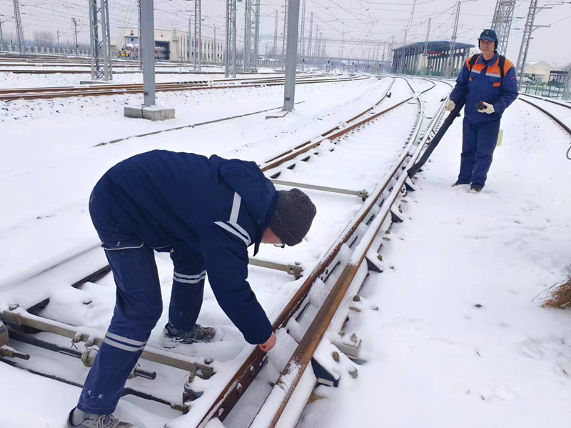 通號、工務人員冒雪清掃道岔,噴灑融雪劑并啟融雪裝置,實時監測設備狀態,確保風雪中運行穩定,護航運營安全。