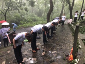 活動當天,大雨紛紛也無法阻擋黨員同志們的熱情,大家來到皇甫山新四軍無名烈士紀念廣場前,在雨中向無名烈士們鞠躬默哀,向英雄烈士們表達最崇高的敬意和緬懷之情;在鮮紅的黨旗下重溫入黨誓詞,并聆聽陵區管理人員講述關于抗戰期間新四軍英勇反抗國民黨反動派對皖東津浦路西根據地進攻的黑狼廟戰役的故事。隨后,大家手持白菊花來到無名烈士墓碑前向烈士們敬獻鮮花并三鞠躬致敬。