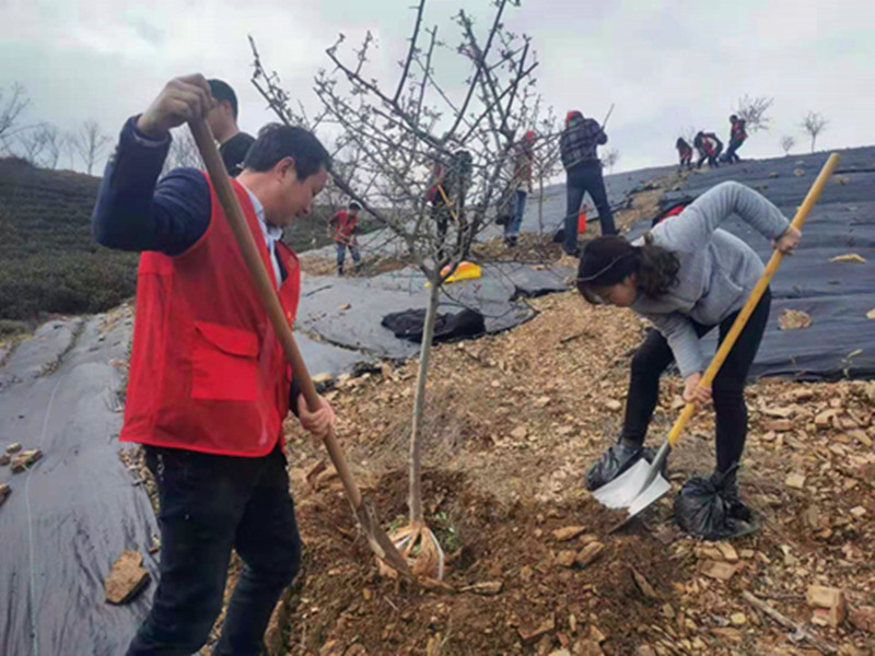 志愿者們3人一組,種下的一棵棵美人梅、紅梅等樹苗含苞待放,為山野間增添一片綠意。