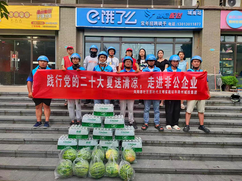 7月27日下午,市城投集團聯合鳳陽路社區組織開展“踐行黨的二十大夏送清涼,走進非公企業”志愿服務活動,為烈日下辛苦工作的外賣小哥們送去西瓜、礦泉水、防暑用品等慰問品,向在高溫下堅守崗位、頑強拼搏外賣小哥們表示親切的慰問,并叮囑大家要合理安排好作息時間,注意身體健康,防止高溫中暑。